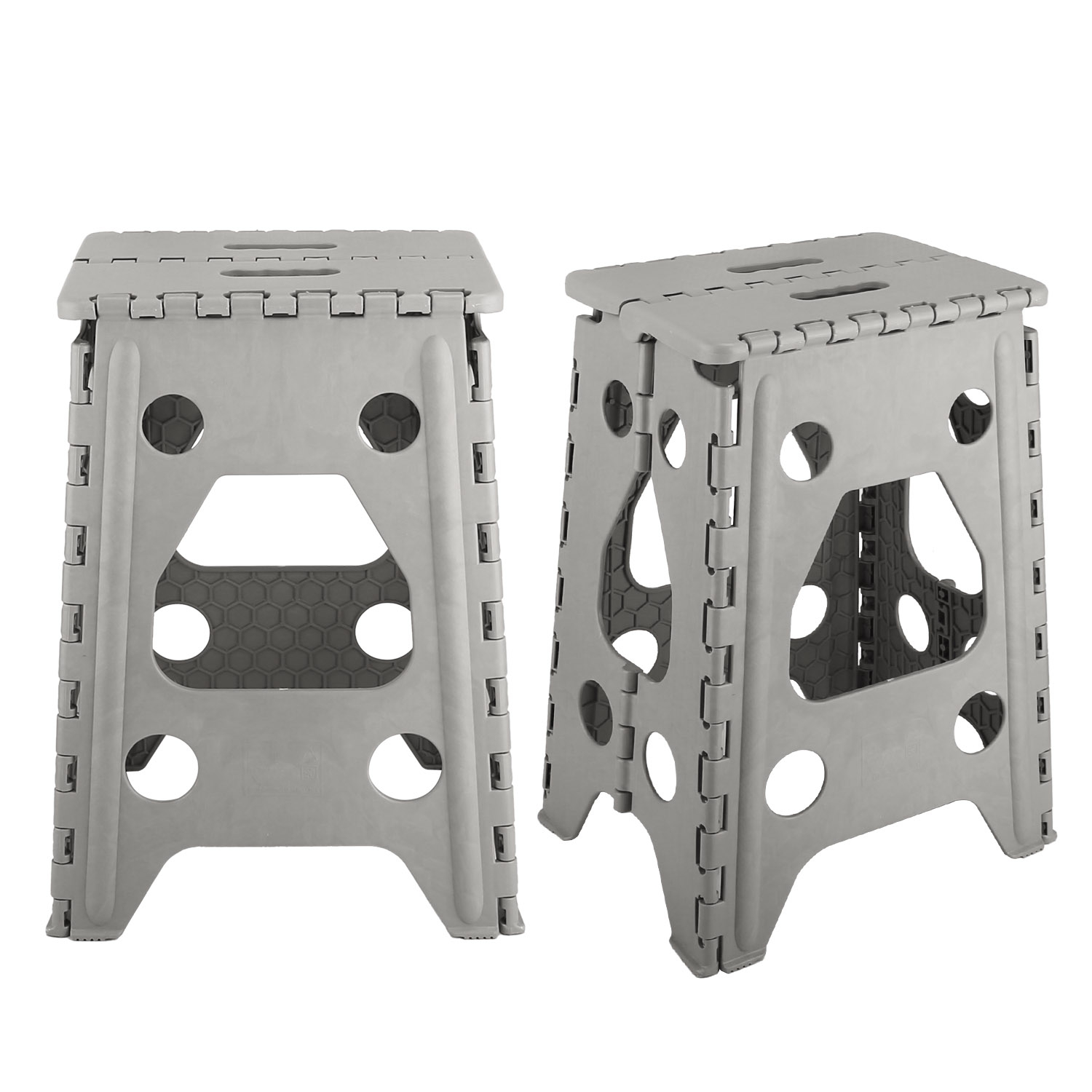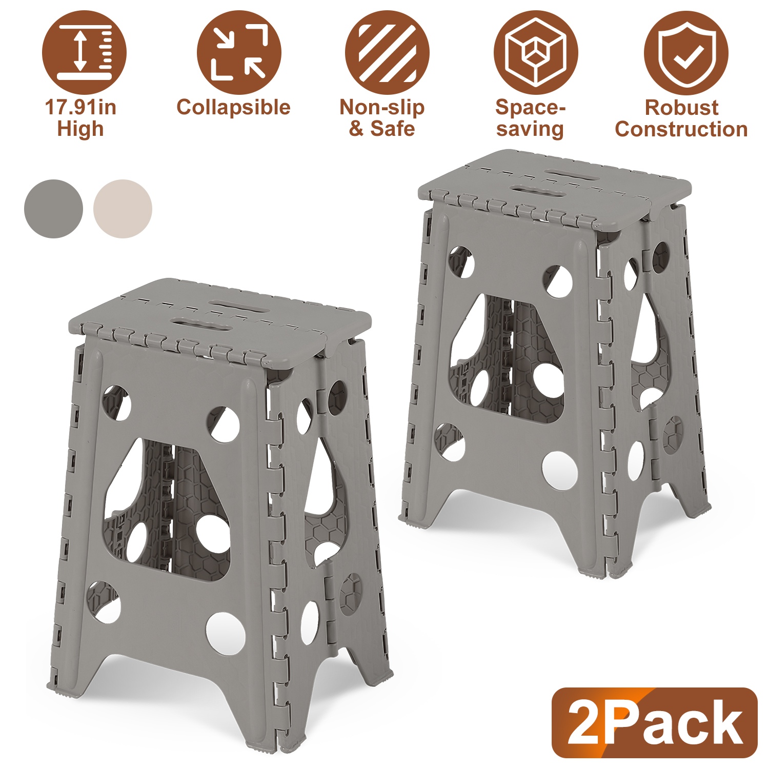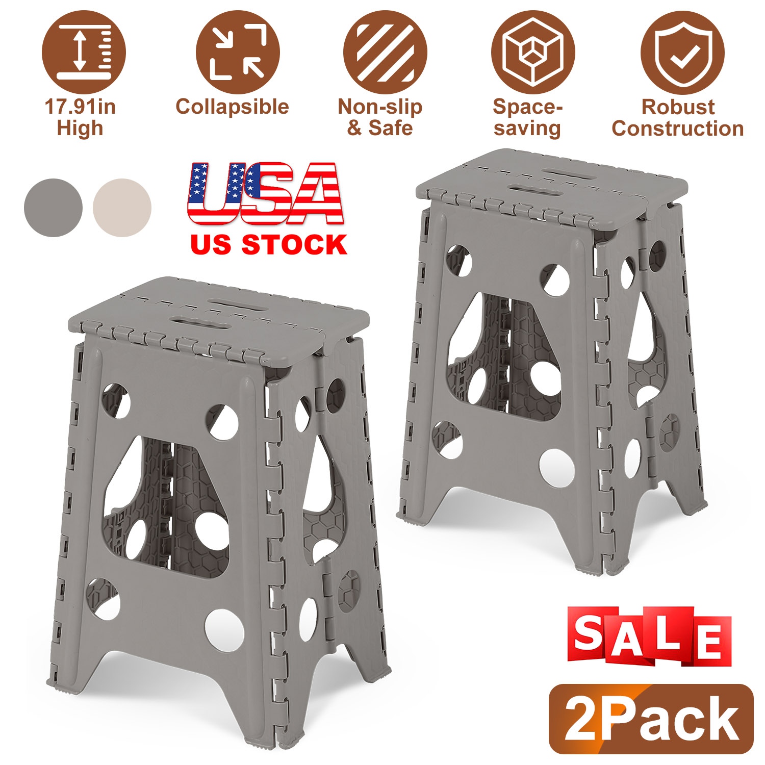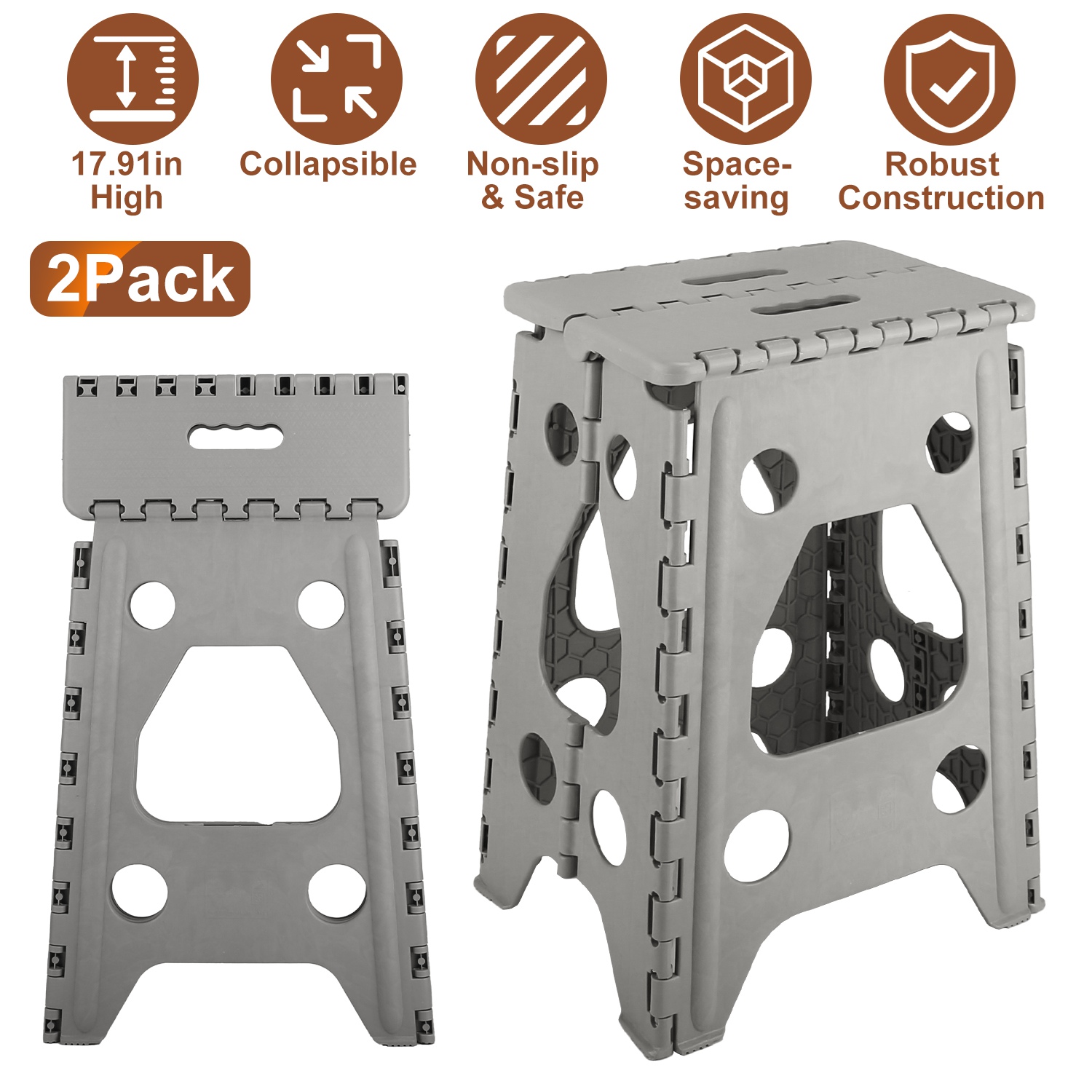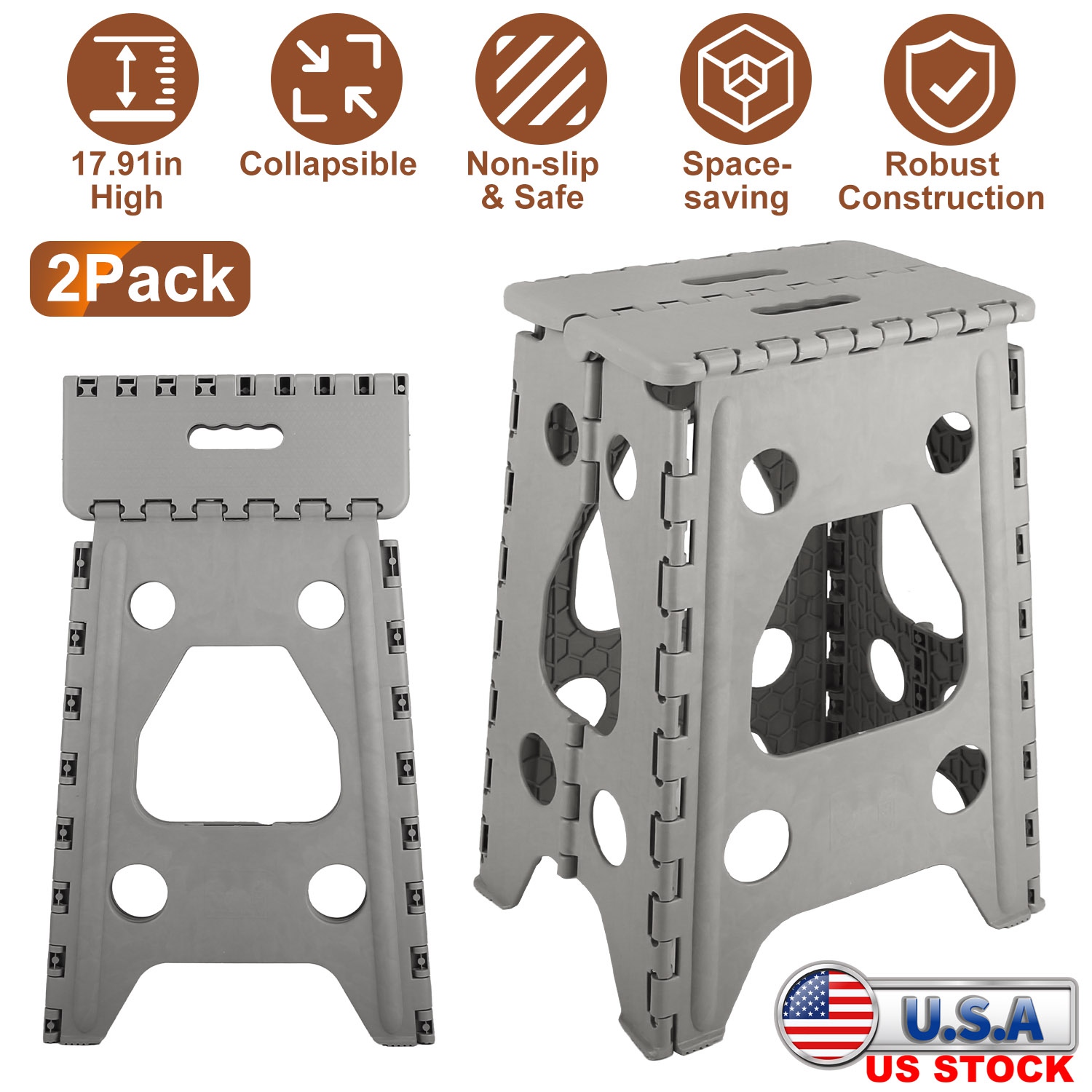 Our 17.91in high folding step stool allows you to easily step on to pick up items in high area. Constructed with premium PP material, bears up to 220lbs weight. Non-slip and secure. Collapsible for convenient storage. Built in a handle for easy hanging and carrying. Come with 2 packs. Great for kitchen, closet, office, garden, RV, camping, fishing or anywhere else you might need a little extra height.