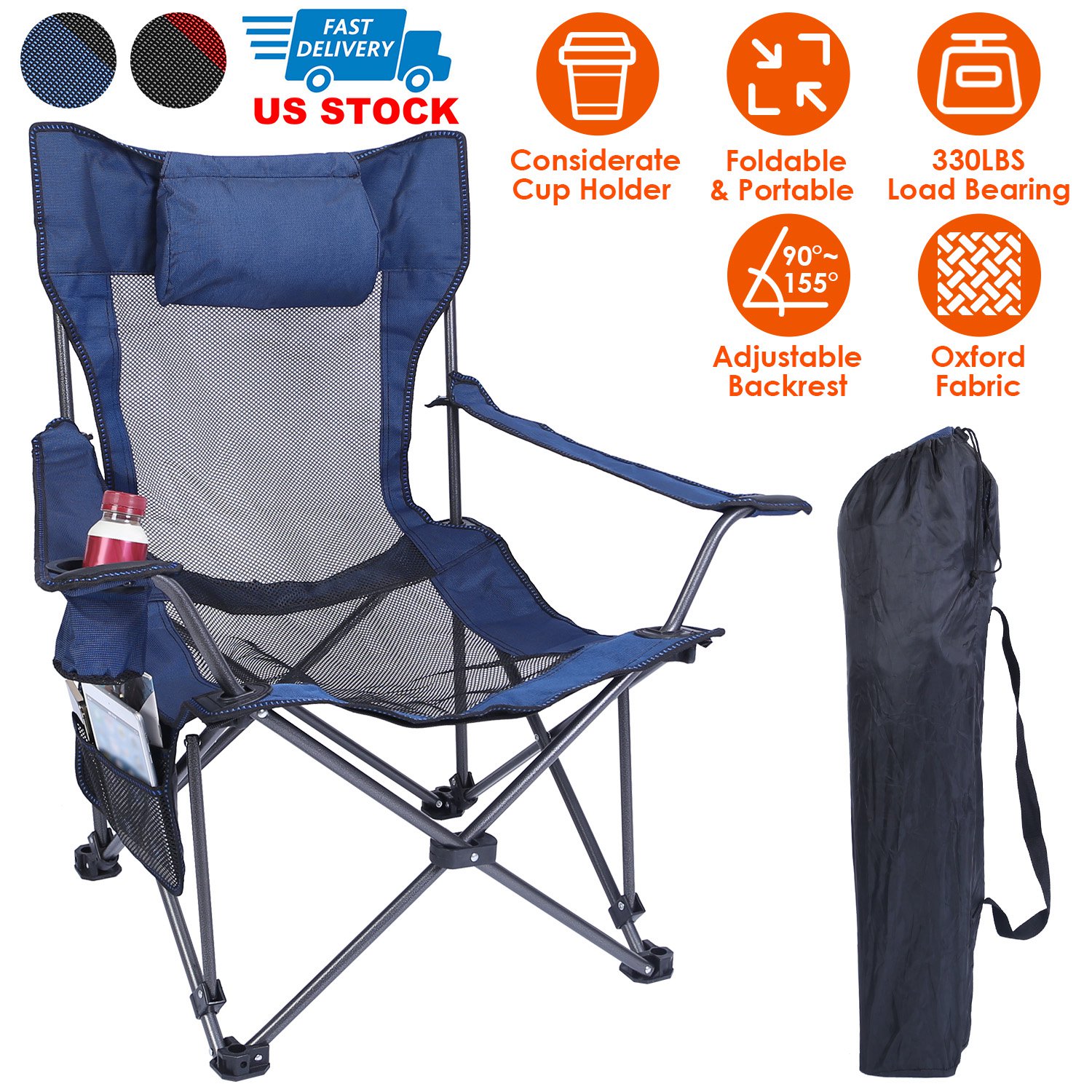 Let’s enjoy the fun and leisure time in outdoor and indoor life. Collapsible folding chair with sturdy steel frame creates the perfect balance between comfort and functionality. Perfect for camping, sports, fishing, travel and office. Premium Oxford fabric with steel tubes ensures you 330lbs max load. Breathable resin seat, armrest and back render you comfortable seating. Set up quickly, can be opened and folded within seconds and packs easily back into its carry bag for storage or travel. Mesh cup holder keeps a beverage within reach. Also comes with a side pocket on side armrest, convenient to put your essentials. Carry bag included for easy transport and storage.
