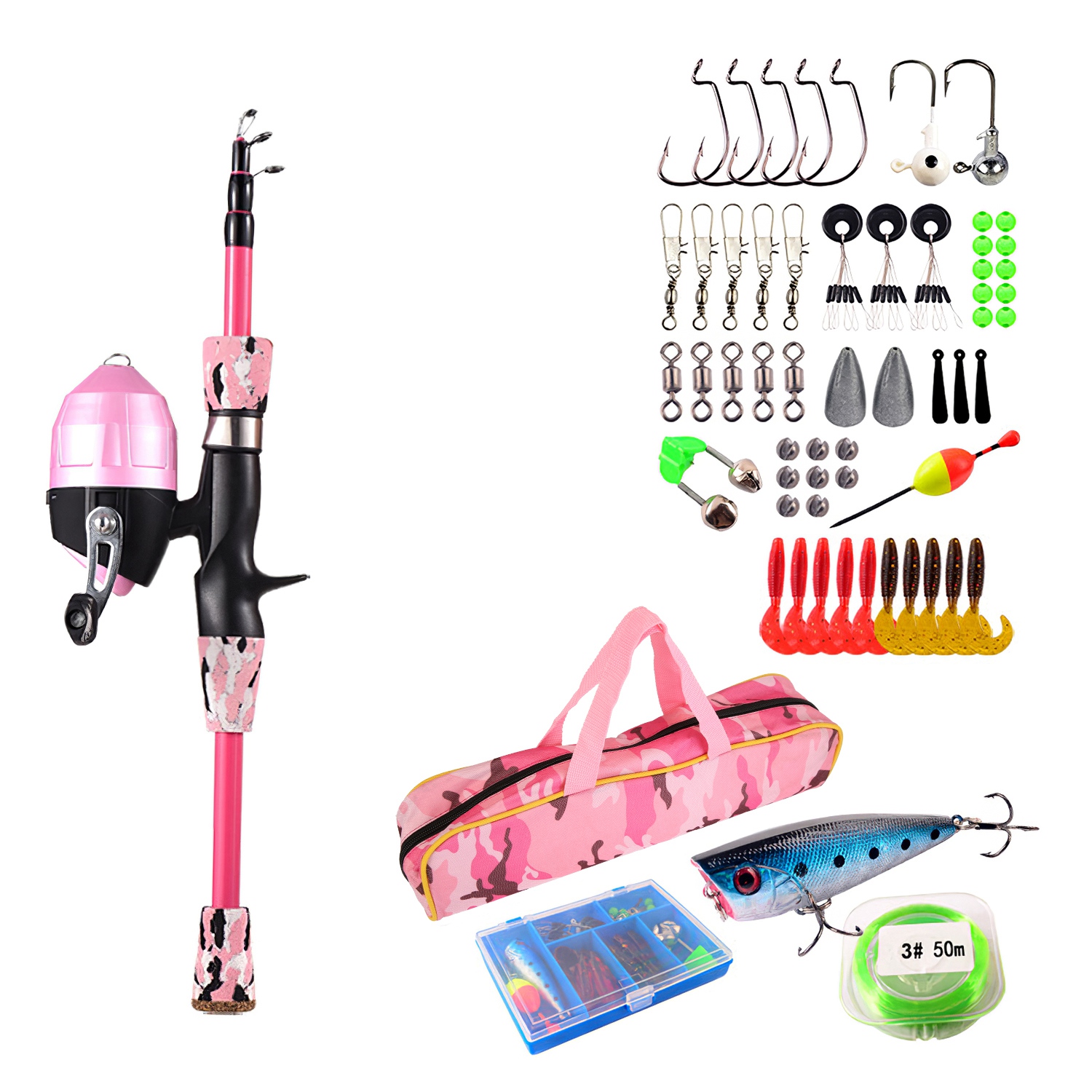 Are you looking for an appropriate telescopic fishing rod and reel combo kit for your kids? Our fishing pole set is sure to arouse your kids’ interest and help them master fishing skills. Features 2 color options(Blue/Pink) and 2 length options(4FT/5FT), an ideal fishing gear for boys or girls aged 5+ years old! The kids fishing rod handle is easy to grip. The push-button style reel is child friendly and spins smoothly. We also offer 1 backup fishing line and 56Pcs baits suited to different fishing situations. The telescopic fishing rod is collapsible and portable enough to carry along with the included travel bag. Thrill them with this kids fishing starter kit and you will see the bright smile on their face!