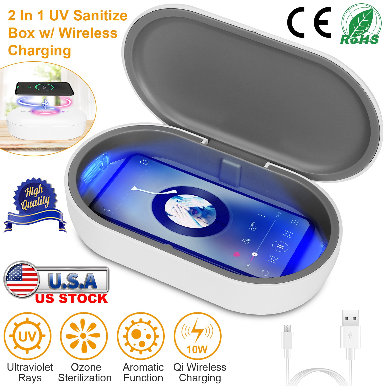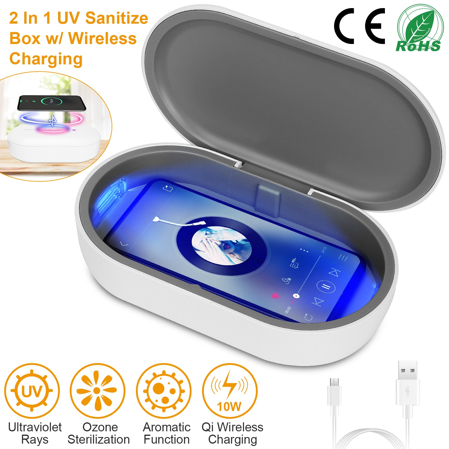 This is the Sanitizer Box everyone should get, especially in an epidemic period. UV sanitize box featured with 360degree sanitizing, eye protection function, eliminate up to 99% of germs and bacteria within 18 minutes or 30 minutes. The UV sterilizer can also works as an aromatherapy diffuser to freshen your devices. Combines the sanitize function with wireless charging. The generously-sized yet compact UV phone sanitizer will fit cell phones up to 6.5'' as well as your earphone, jewelry, wallet, credit cards, car keys or any other gadget. Enjoy yourself with a cup of coffee while giving your gadgets a complete disinfection spa.