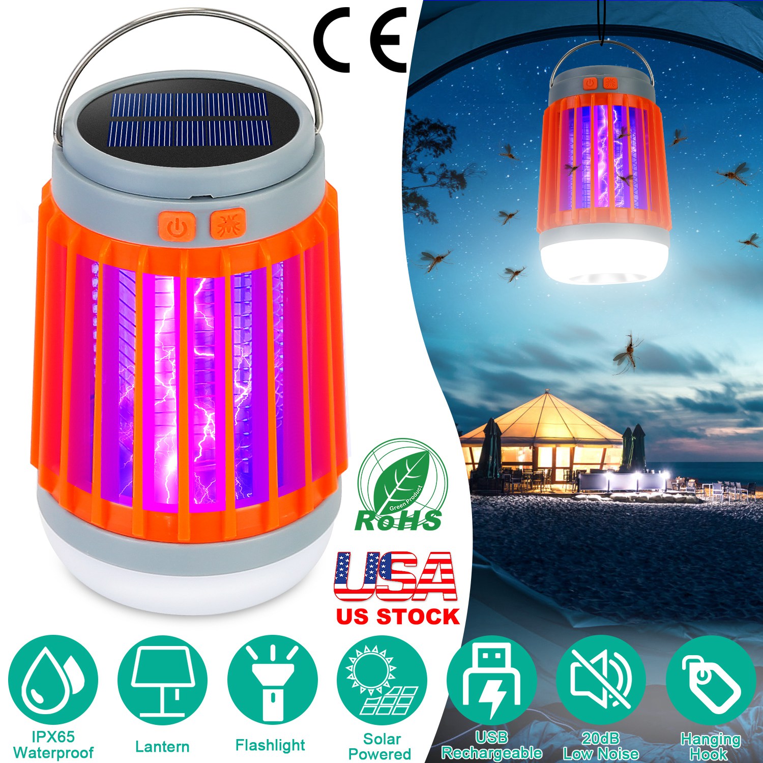 Are you disturbed by the surrounding mosquitoes? Our bug zapper can lure the bugs by releasing UV light within 108sq.ft area and kill them instantly via 600V high voltage grid. No chemical, non-toxic, odor free, good for the infants, pregnant mother and pets. When in low battery power, it can be charged by solar panel or via USB cable conveniently. Featured with UV and other 4 lighting modes and IPX6 waterproof performance, perfect for camping tents, hiking, fishing, climbing, meet your different illuminating needs.
