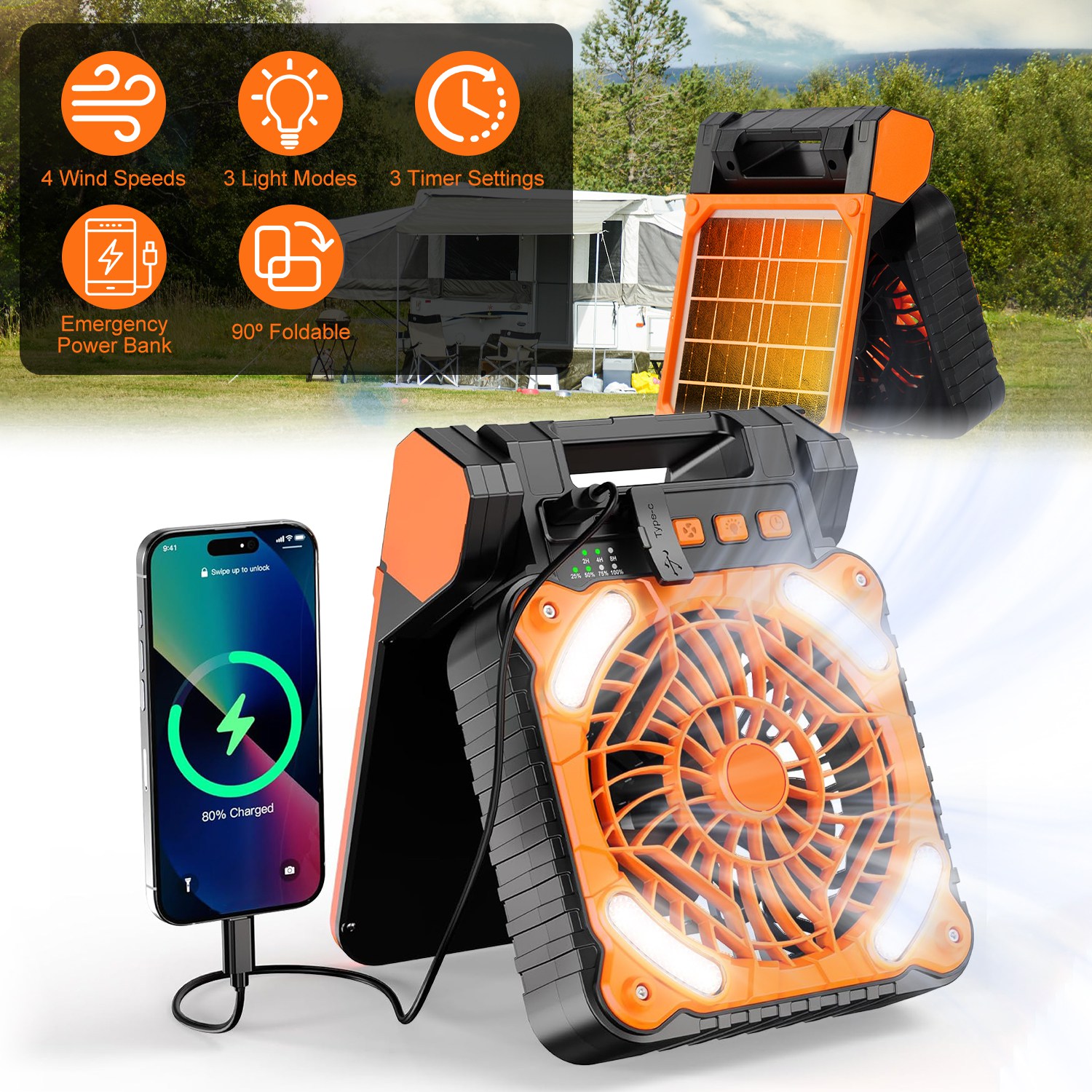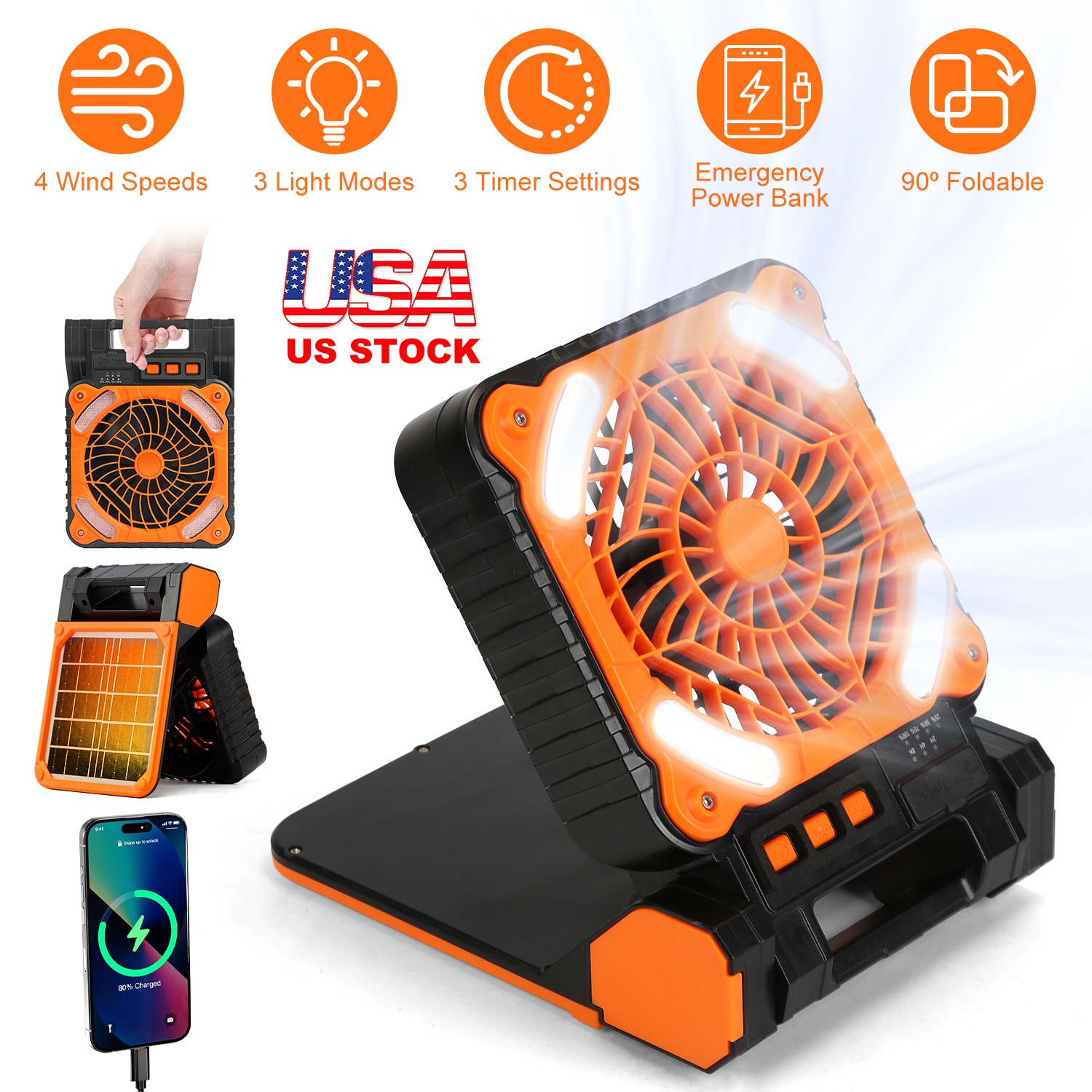 Our solar camping fan with lantern is a must-have companion for your trip. Combine portable fan, LED light and emergency power bank in one unit, making it an ideal gear for home, camping, fishing, hiking, backpacking, emergencies, or other indoor & outdoor activities. Feature 4 wind speeds, 3 timer settings, 3 light modes and 90º adjustable angle. Built in rechargeable 5200mAh battery, offer up to 20 hours of refreshing airflow and provide up to 36 hours of illumination. Can be powered via USB or solar energy. Lightweight and compact. Have a built-in handle for easy carrying.