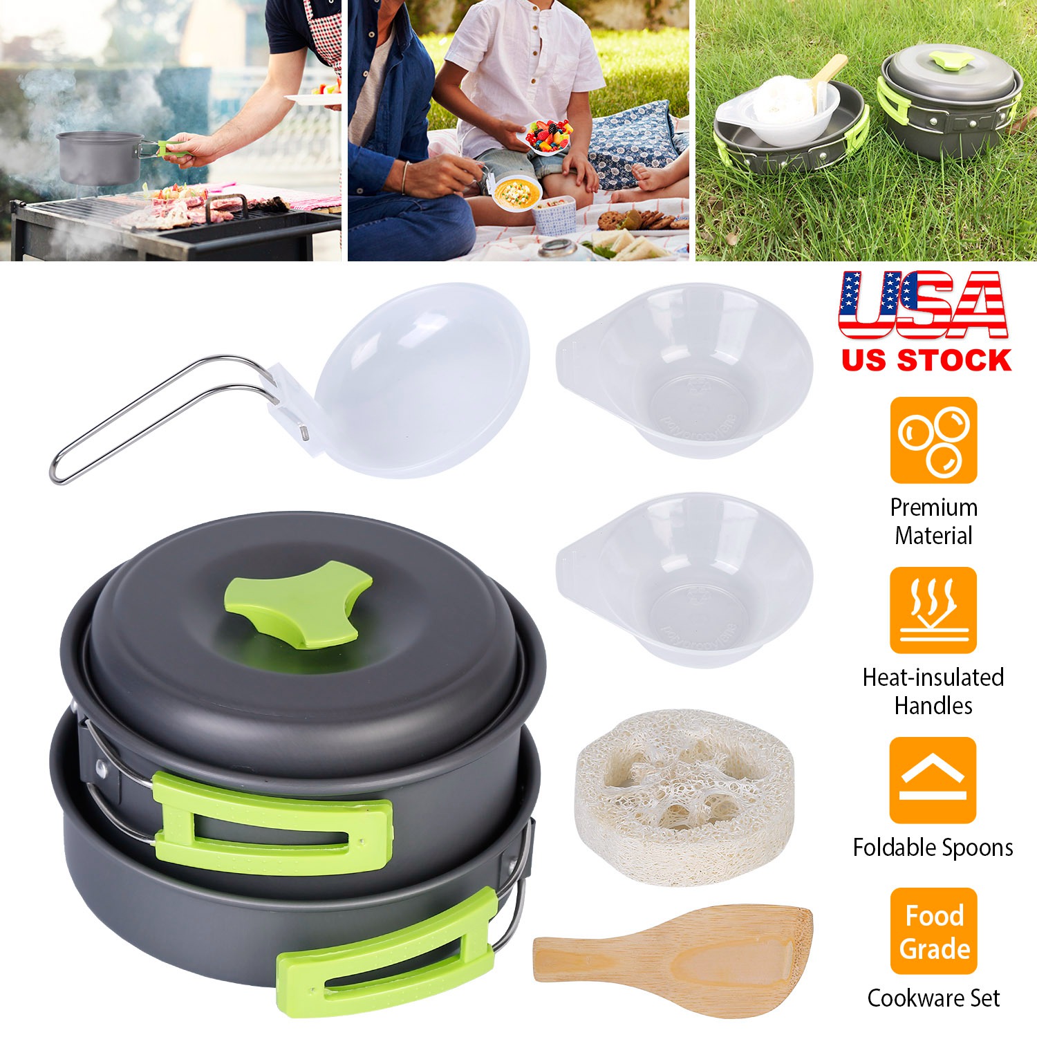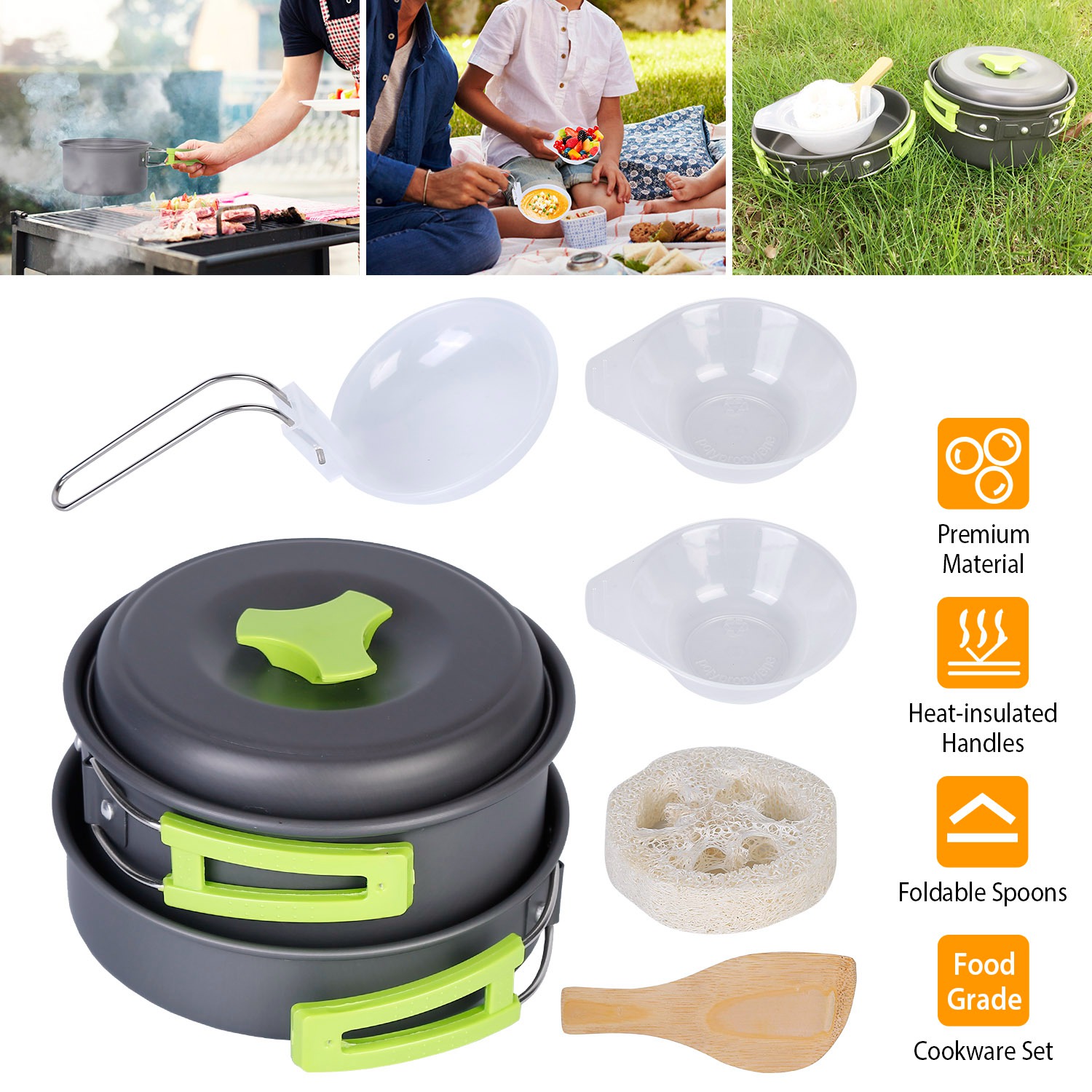 This cookware set contains 1 pot, 1 pan, 2 bowls, 1 spoon, 1 spatula, and 1 cleaning tool for making hot and delicious food during camping, hiking, and any other outdoor activity. Made of non-toxic and lightweight anodized aluminum, it’s safe, easier to clean and carry. Most of this set contains a foldable and heat-insulated handle, which will not burn your hands. The whole set can be packed in a storage bag, space-saving and convenient.