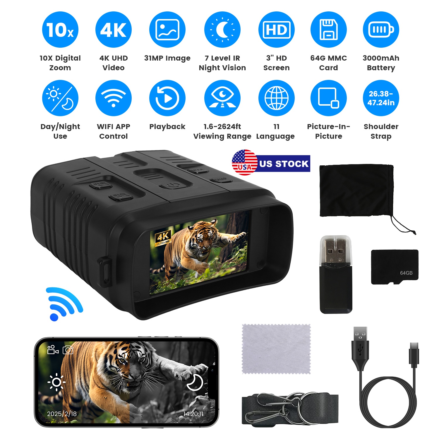 Home > Night Vision Goggles 4K Full-Color Binoculars 10X Zoom with 2624ft Viewing Range 3\'\' Screen 64G MMC Card WIFI APP Control Save Photo and Video for C
